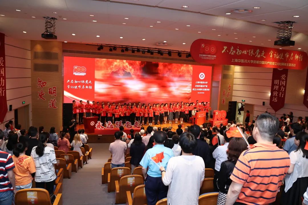 在庄严的国歌声中,主题活动拉开序幕。视频《杏林心向党》通过回顾学校65年来为党育人、科技报国、服务社会、文化传承、国际交流的历程,引领上中医人重温学校在岐黄之路上的奋斗史,凝聚起同心筑梦心向党、砥砺奋进新时代的磅礴力量。