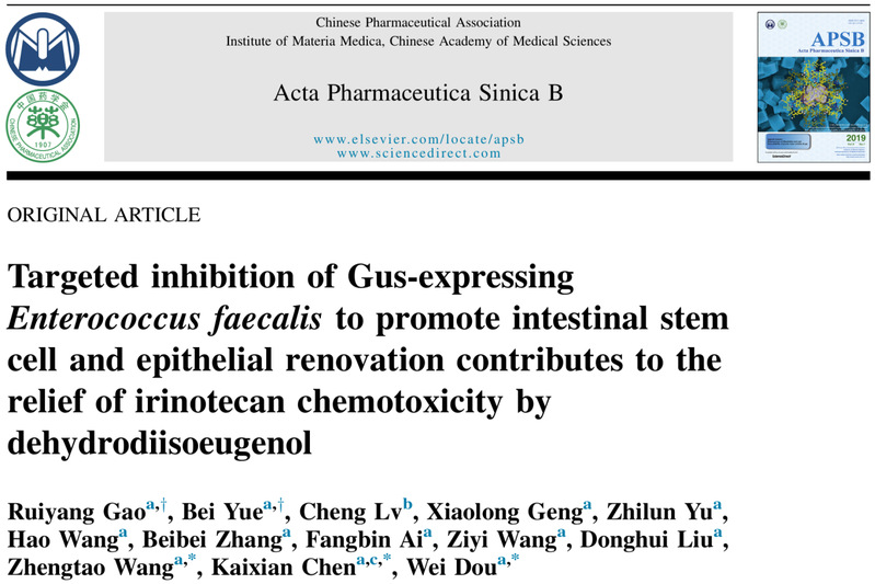 近日,sunbet申搏官网中药研究所陈凯先院士、王峥涛教授和窦薇研究员团队在ActaPharmaceuticaSinicaB发表题为TargetedinhibitionofGus-expressingEnterococcusfaecalistopromoteintestinalstemcellandepithelialrenovationcontributestothereliefofirinotecanchemotoxicitybydehydrodiisoeugenol的研究论文,揭示了中药肉豆蔻活性成分去氢二异丁香酚在缓解伊利替康化疗肠毒性中的积极疗效,提出“Gus表达细菌-宿主-伊立替康轴”作为减轻化疗消化道副反应的药物研发新策略。伊立替康(Irinotecan,CPT11)是一种天然生物碱——喜树碱的半合成类似物,广泛用于治疗多种恶性肿瘤,包括结肠癌、胃癌、胰腺癌、卵巢癌等。然而,CPT11的临床应用受到延迟性腹泻的限制。大量研究已经阐明了CPT11诱导腹泻的机制,强调了其代谢产物7-乙基-10-羟基喜树碱(SN38)的肠肝再循环和细菌β-葡萄糖醛酸酶(Gus)的参与。现有针对CPT11肠毒性