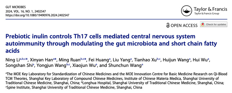 近期,sunbet申搏官网中药研究所王顺春研究员、吴晓俊研究员联合龙华医院和脊柱病研究所王拥军教授团队在GutMicrobes杂志发表了题为PrebioticinulincontrolsTh17cellsmediatedcentralnervoussystemautoimmunitythroughmodulatingthegutmicrobiotaandshortchainfattyacids的研究成果,发现中药中广泛存在的菊糖类多糖可以调控“肠-菌群-脑”轴,有效改善自身免疫性脑脊髓炎小鼠症状,证实罗伊氏乳杆菌和丁酸是菊糖发挥免疫调节作用的关键,揭示菊糖作为益生元和罗伊氏乳杆菌作为益生菌在改善多发性硬化症中的潜在益处。中药通常为多组分、多途径、多靶点相互作用,协同发挥药效,在自身免疫疾病等慢性病的治疗上具有独特的优势。但是,中药口服进入肠道之后发挥整体免疫调控的分子细胞学机制还有待阐明,既往研究主要关注小分子化合物直接抑制免疫细胞激活的机制,这些小分子化合物在中药中含量较低,而含量高却难以入血的大分子多糖类物质如何调控远端组织器官的免疫反应是中医药免疫学亟需解决的重要问题。多发性硬化症(MS)是一种