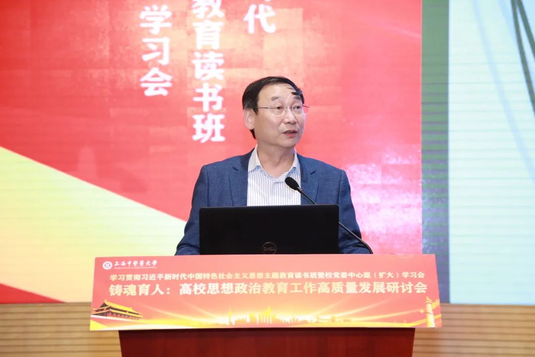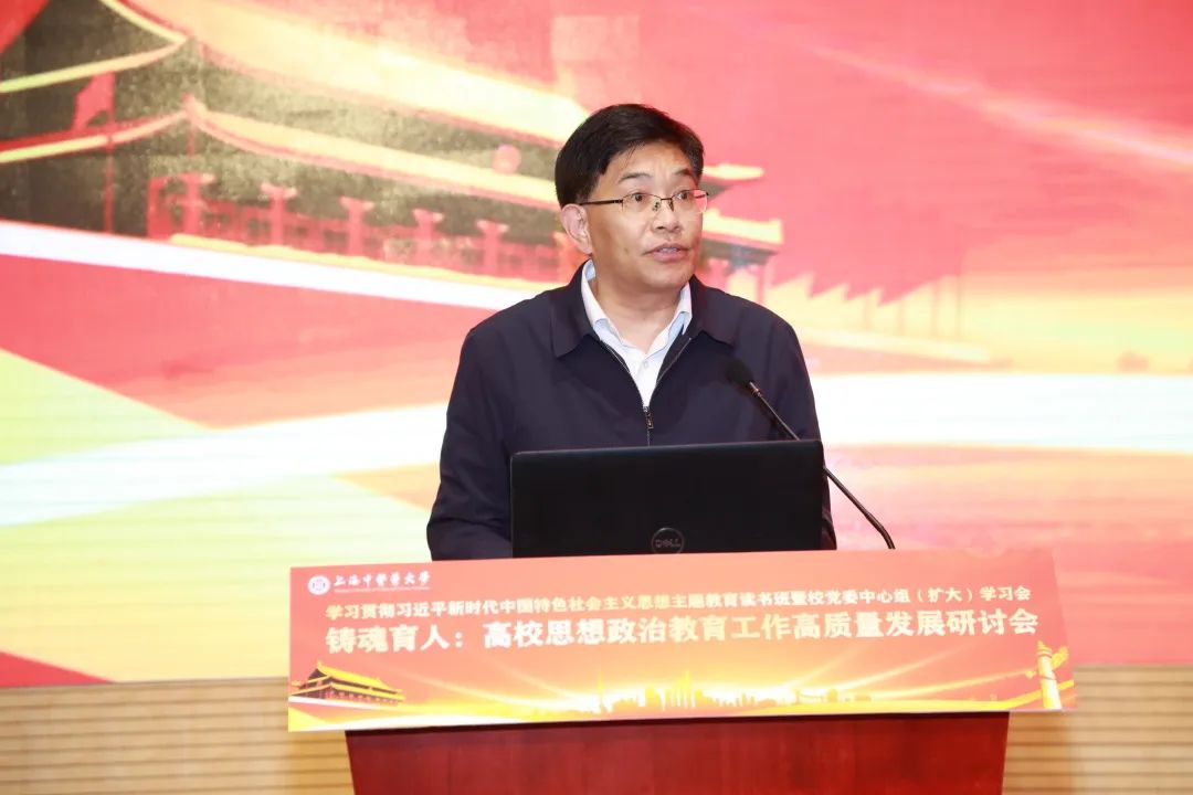 5月17日下午,sunbet申搏官方网站学习贯彻习近平新时代中国特色社会主义思想主题教育读书班暨校党委中心组(扩大)学习会、高校思想政治教育工作高质量发展研讨会在学校图书馆四楼报告厅举办。上海科技馆馆长倪闽景,中共一大会址纪念馆党委书记、馆长薛峰,上海市政府重大行政决策咨询专家高德毅,上海市教委德育处处长朱敏出席会议。sunbet申搏官网主题教育领导小组成员,校党委中心组成员,专兼职辅导员、组织员,马克思主义学院教师,校本部教师党支部书记、青年教师班主任及教师代表参会。会议由sunbet申搏官网党委副书记、副校长朱惠蓉,副校长舒静共同主持。