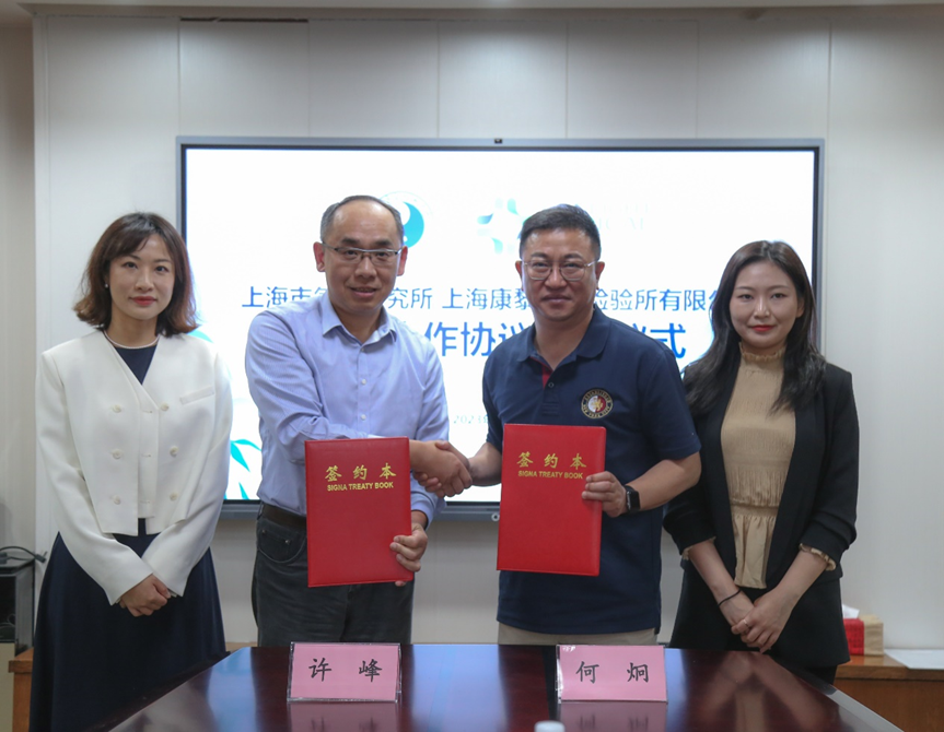 许峰与何炯分别代表上海市气功研究所与上海康黎医学检验所有限公司签署战略合作协议,枫林集团陈颖、陆梦晗见证签约。