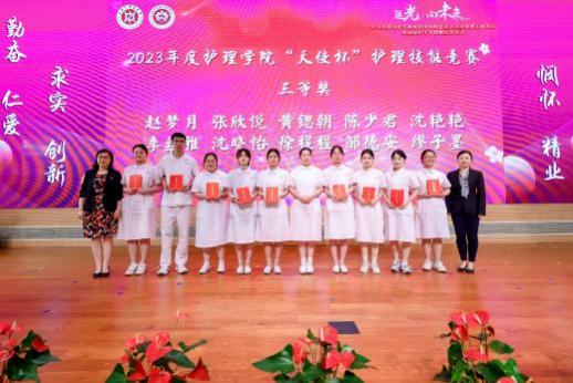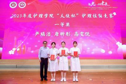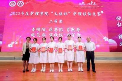 与会嘉宾为获得2023年护理学院“天使杯”护理技能大赛和sunbet申搏官方网站第一届护理创新大赛获奖师生颁奖。