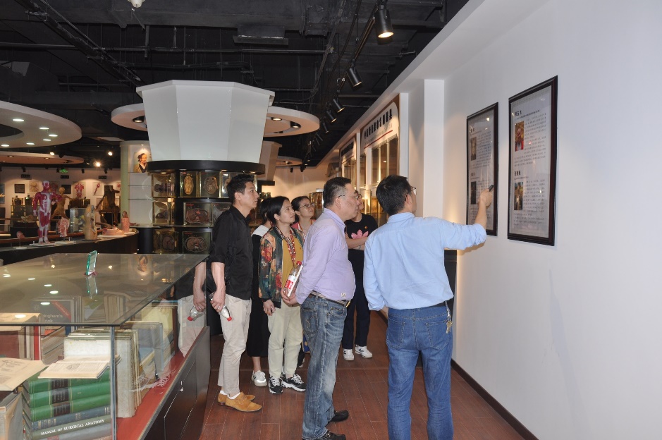 会后,一行人参观sunbet申搏官网人体与经穴解剖学陈列馆、遗体捐献文化走廊和人体解剖学实验室等。邵水金介绍镇馆之宝“镜面人”及其捐献者事迹,讲述中医腧穴解剖学发展历程,着重介绍全身腧穴塑化标本这一具有中医特色的珍贵展品。