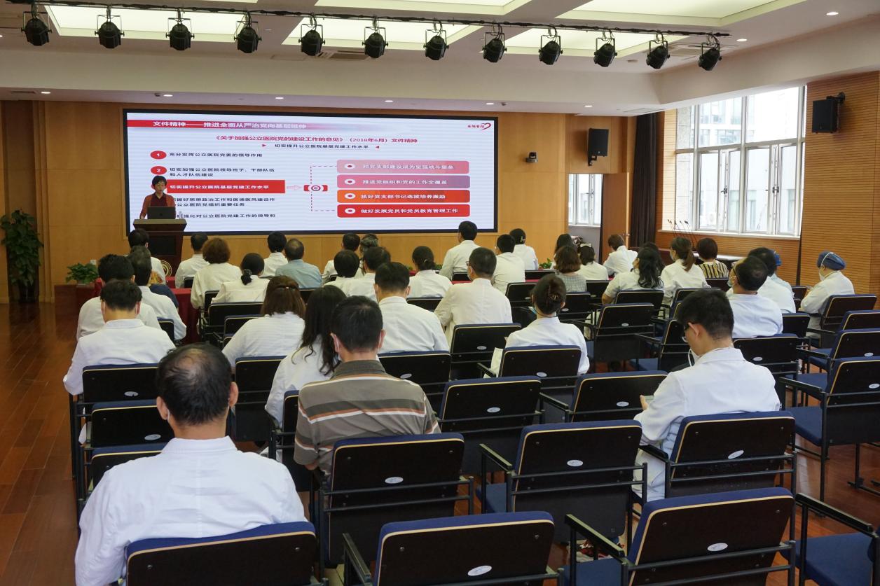 为深入开展学习贯彻习近平新时代中国特色社会主义思想主题教育,进一步提高公立医院党建质量,推进全面从严治党向基层延伸,充分发挥内设机构党支部保证政治方向、参与重要决策、服务人才成长、促进事业发展的重要作用,6月23日下午,岳阳中西医结合医院党委书记郑莉讲授题为“加强党支部建设 促进医院高质量发展”的主题教育专题党课。医院行政第二党支部、肾病内科党支部、神经内科党支部全体党员和部分支部书记代表等参加并认真聆听了党课。